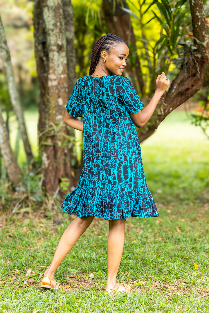Bring vibrant energy and effortless charm to your wardrobe with our Blue & Black African Print Short Dress. Designed in a relaxed shift silhouette, this dress offers comfort without compromising style; perfect for warm days and easy outings.