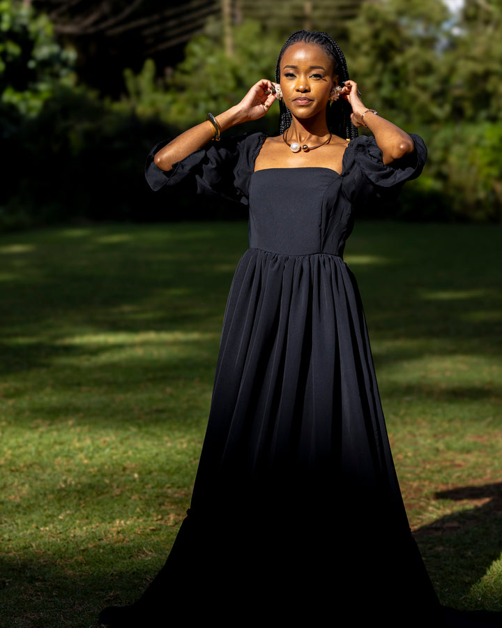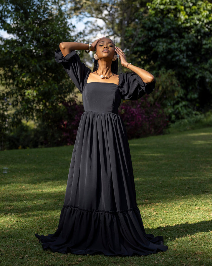 Own every moment in our Black Puff-Sleeve Maxi Dress, a statement of elegance designed for the woman who moves with quiet confidence and undeniable grace. Crafted from soft, flowing fabric that glides beautifully with every step, this dress features voluminous puff sleeves, a square neckline, and a full gathered skirt that creates stunning movement. The rich black tone adds depth and sophistication, making it a perfect choice for weddings, evening events, or elegant garden parties.
