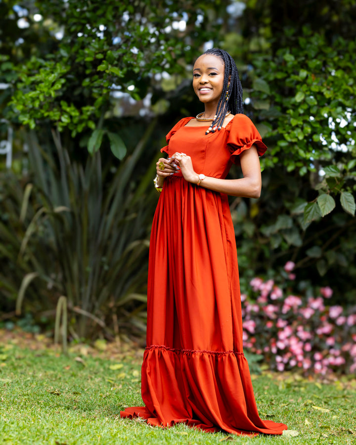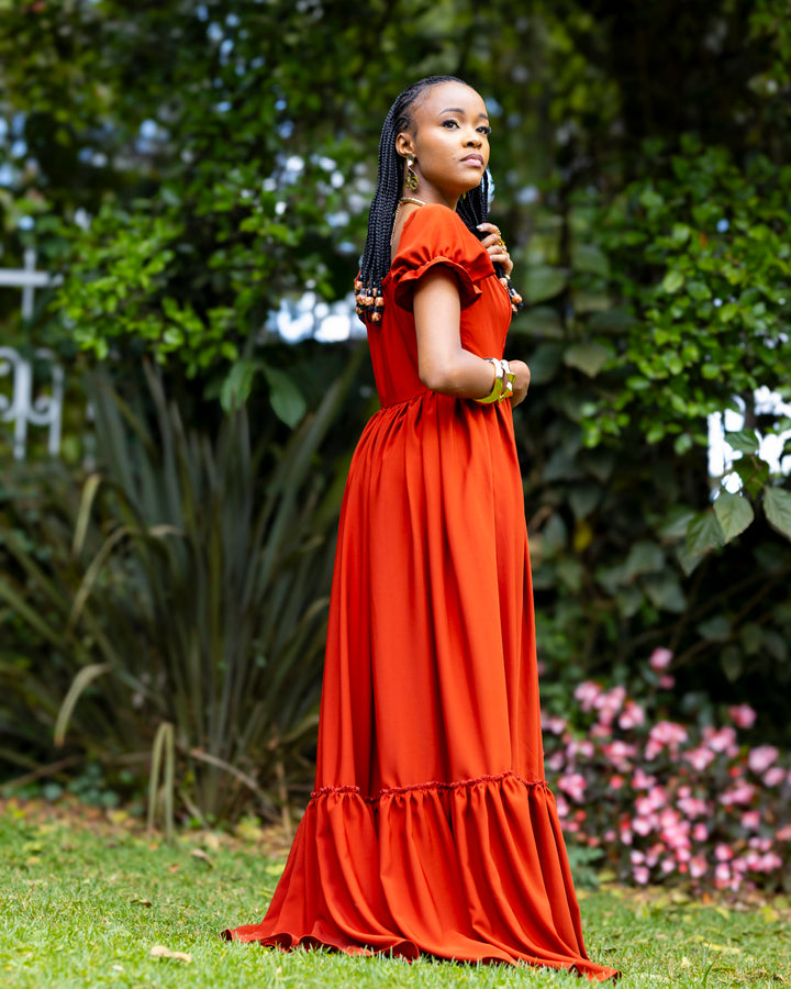 Bring sunshine and sophistication into your wardrobe with our Marigold Maxi Dress, designed for the woman who loves timeless beauty with a playful twist. Crafted from soft, flowy fabric that drapes beautifully with every movement, this dress features elegant puff sleeves, a fitted bodice, and a full gathered skirt that moves like poetry. The rich rust tone adds warmth and depth; perfect for garden weddings, brunches, or elegant outdoor events.