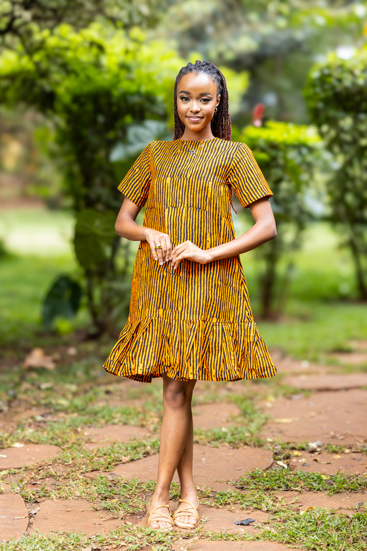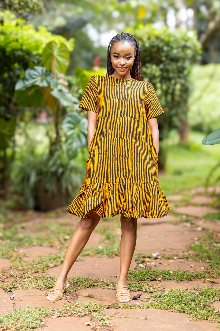 Bring vibrant energy and effortless charm to your wardrobe with our Yellow & Black Striped African Print Short Dress. Designed in a relaxed shift silhouette, this dress offers comfort without compromising style; perfect for warm days and easy outings.