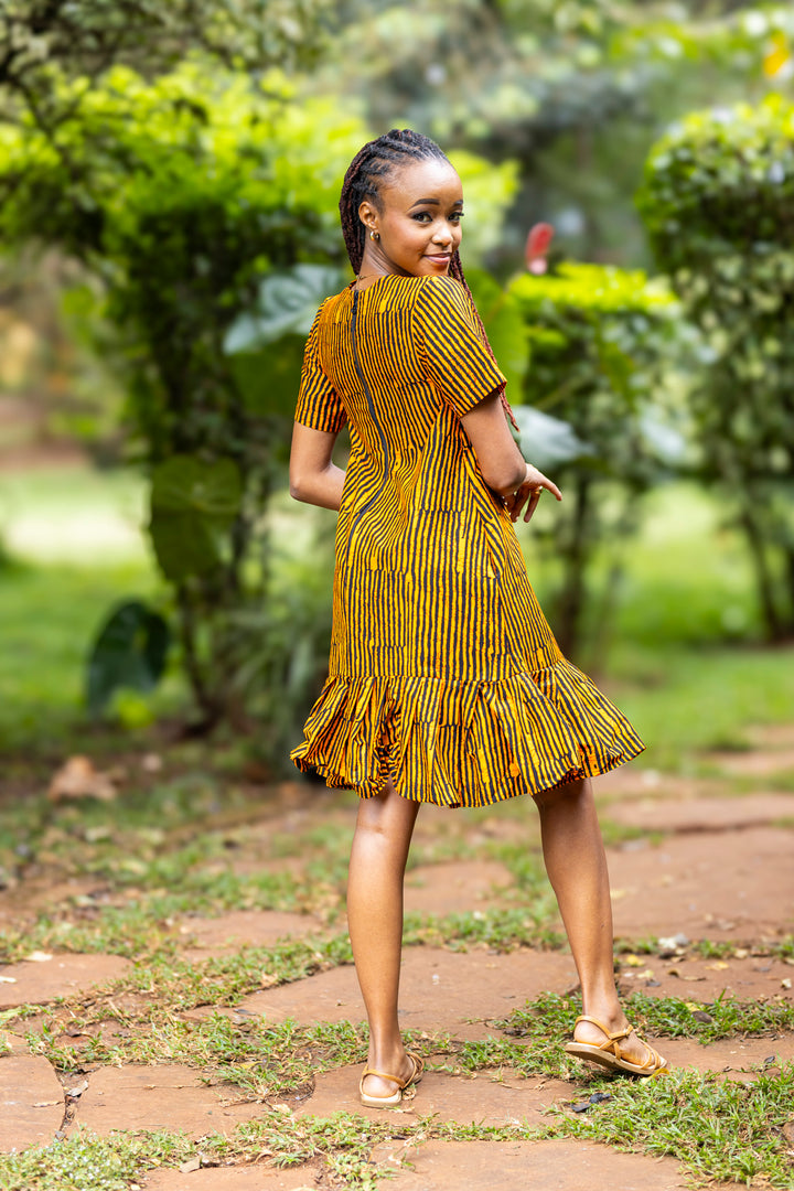 Crafted from breathable cotton Ankara fabric, it features striking vertical stripes that elongate the frame, while the flared ruffle hem adds a flirty, feminine touch. The round neckline and short sleeves keep it classic, making it a timeless piece you’ll reach for again and again.