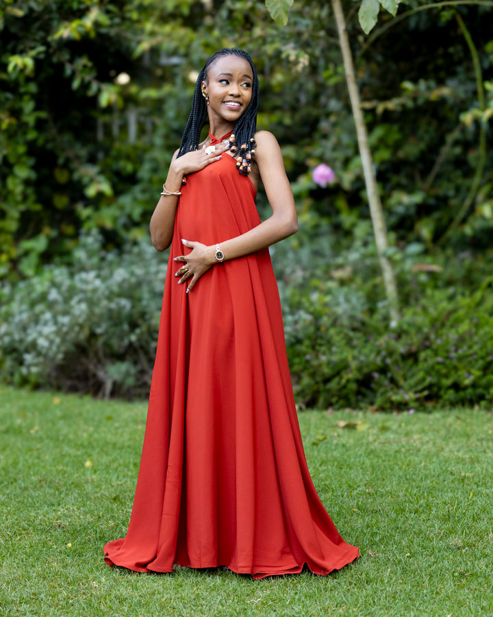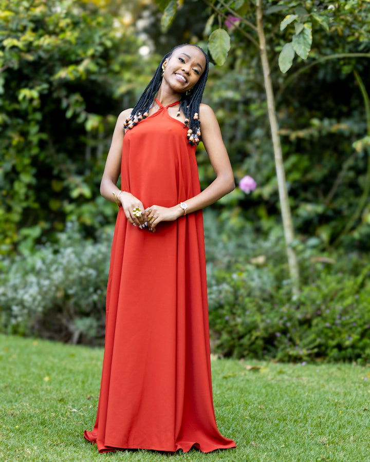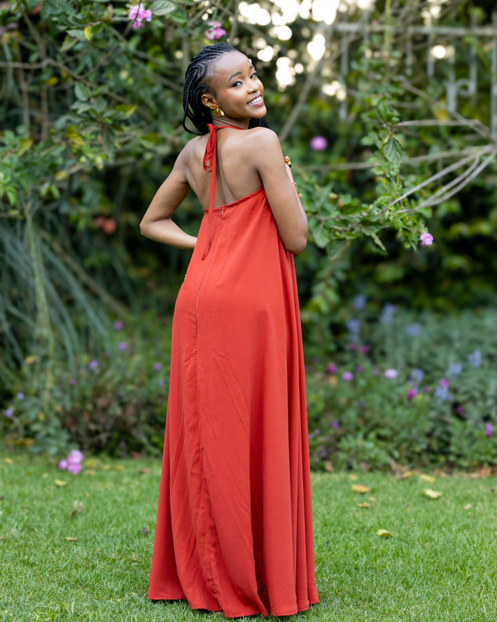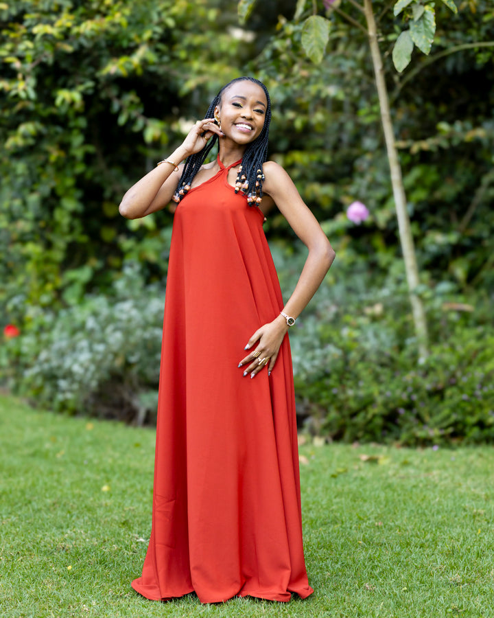 Radiate confidence and poise in our Uhuru Halter Maxi Dress, a statement piece that brings bold simplicity to life. Designed in a captivating burnt orange hue, this dress blends effortless elegance with a touch of modern flair.